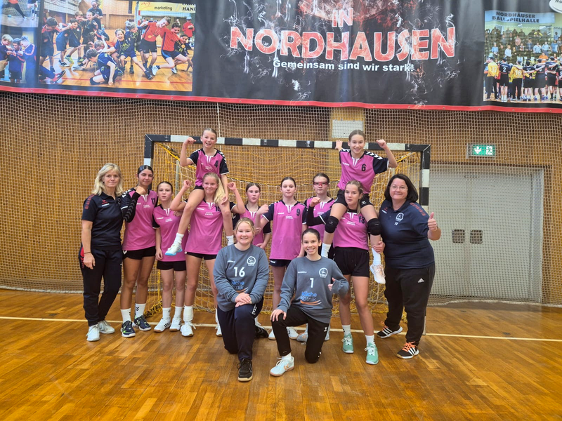 Am 25.Oktober trat unsere wJd zu zwei Spielen an und konnte beide Partien für sich entscheiden!Im ersten Spiel trafen wir auf den Nordhäuser SV 2. Von Beginn an war klar, dass dieses Spiel körperlich und kämpferisch einiges abverlangen würde. Nach einer guten ersten Halbzeit ,die wir mit 6:3 für uns entscheiden konnten, zeigten wir auch in der zweiten Hälfte eine sehr starke Abwehrleistung und hielten den Gegner konsequent auf Abstand. Am Ende gewannen wir verdient mit 14:6. Das zweite Spiel gegen den SV Bleicherode entwickelte sich zu einem echten Krimi. Beide Teams schenkten sich nichts – es war ein ständiges Kopf-an-Kopf-Rennen, das uns allen viel abverlangte. Dank großen Teamgeists, Kampfwillen und lautstarker Motivation von der Bank konnten wir am Ende auch dieses enge Duell knapp, aber verdient, mit 12:11 (Halbzeit 8:7) für uns entscheiden.Mit diesen beiden Siegen klettert unsere wJd in der Tabelle vom vierten auf den zweiten Platz – ein toller Erfolg, auf den das ganze Team stolz sein kann! Spielerinnen und Tore: Isabell M.(TW), Karla H.(TW), Lilly P., Leni Z.(2), Maily M., Ashley S., Maja K.(10/2), Anna S. (11), Ostara G.(3/1), Alyah S., Luisa P.